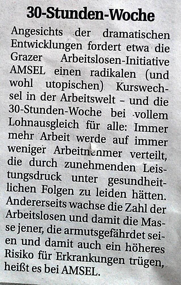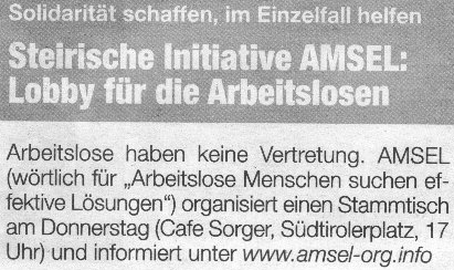 klagen: - - - - - - Presseaussendung 15. September 2009: ERWERBSARBEITSLOSE ALS BILLIGE UND RECHTLOSE ARBEITSKRÄFTE FÜR GEMEINDEN Arbeitslosenverein AMSEL gegen systematische Umgehung regulärer Kollektivverträge durch „Transitarbeit“. - - - leserbrief310709_Fauler Kompromiss (zur verschobenen und gekürzten